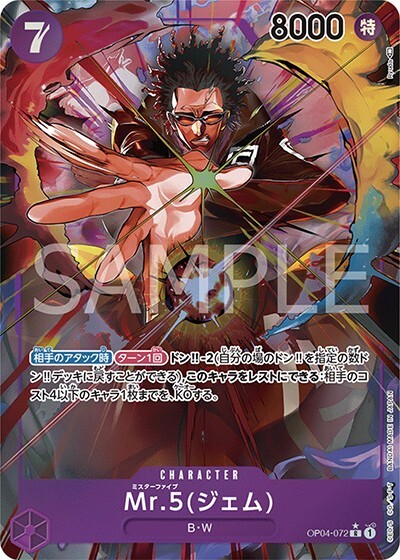 Mr.5(ジェム) 【R】【パラレル】【紫】【OP04-072】【コスト7】【8000】【カウンター0】【相手のアタック時】【ターン1回】B・W