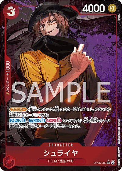 シュライヤ 【SR】【パラレル】【赤】【OP06-009】【コスト3】【4000】【カウンター1000】【ブロッカー】【アタック時】【ブロック時】【ターン1回】FILM/造船の町