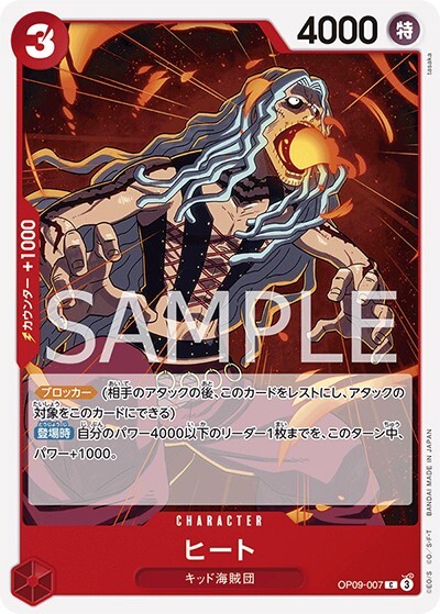 ヒート 【C】【赤】【OP09-007】【コスト3】【4000】【カウンター1000】【ブロッカー】【登場時】キッド海賊団