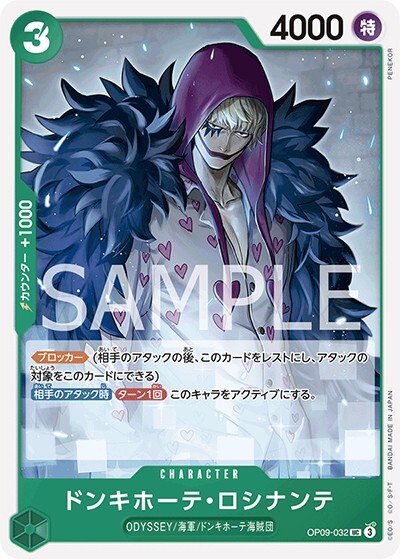 ドンキホーテ・ロシナンテ 【UC】【緑】【OP09-032】【コスト3】【4000】【カウンター1000】【ブロッカー】【相手のアタック時】【ターン1回】ODYSSEY/海軍/ドンキホーテ海賊団