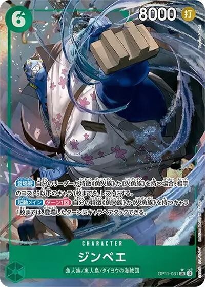 ジンベエ 【SR】【パラレル】【緑】【OP11-031】【コスト6】【8000】【カウンター0】【起動メイン】【登場時】【ターン1回】魚人族/魚人島/タイヨウの海賊団
