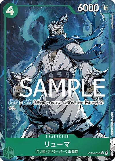 リューマ 【PRB-01】【R】【パラレル】【緑】【OP06-036】【コスト4】【6000】【カウンター0】【KO時】【登場時】ワノ国/スリラーバーク海賊団
