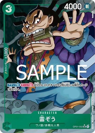 雷ぞう 【UC】【フルアート】【緑】【OP01-052】【コスト3】【4000】【カウンター1000】【アタック時】【ターン1回】ワノ国/赤鞘九人男