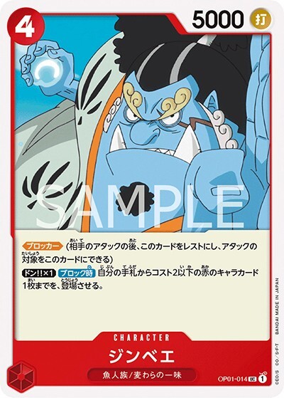 ジンベエ 【UC】【赤】【OP01-014】【コスト4】【5000】【カウンター0】【ブロック時】【ブロッカー】魚人族/麦わらの一味
