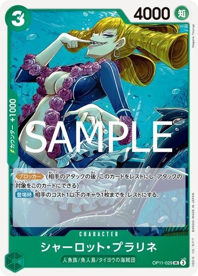 シャーロット・プラリネ 【UC】【緑】【OP11-029】【コスト3】【4000】【カウンター1000】【ブロッカー】【登場時】人魚族/魚人島/タイヨウの海賊団